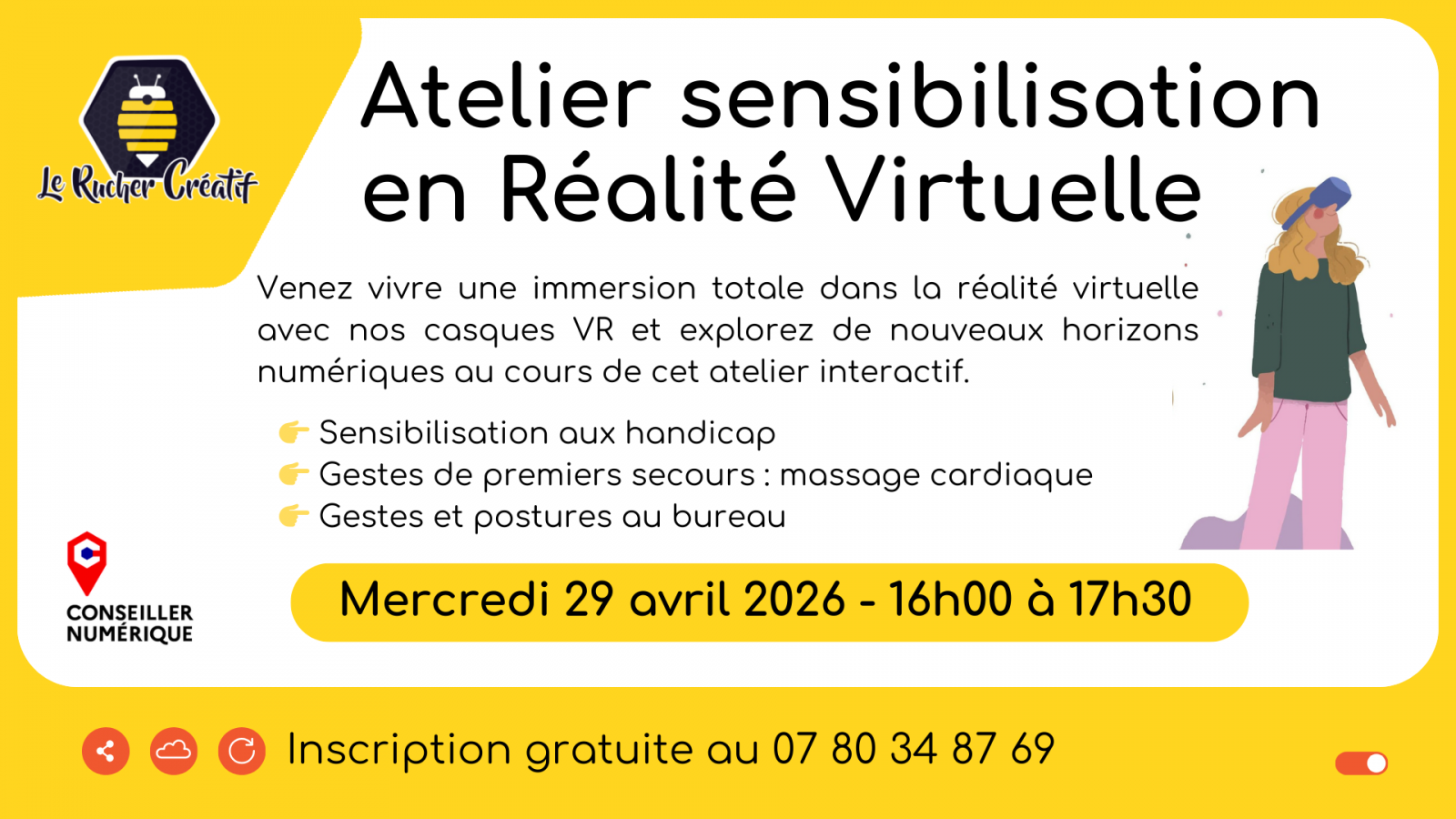 Öffnungszeiten Preise Dienstleistungen Zurück zur Liste Öffnungszeiten Am 29 April 2026TageÖffnungszeitenMittwoch 16h0017h30 Preise Gratuit Dienstleistungen Typen Begleitung Einführung/Kennenlernen Kulturelle Aktivitäten Entdeckung Virtuelle Realität