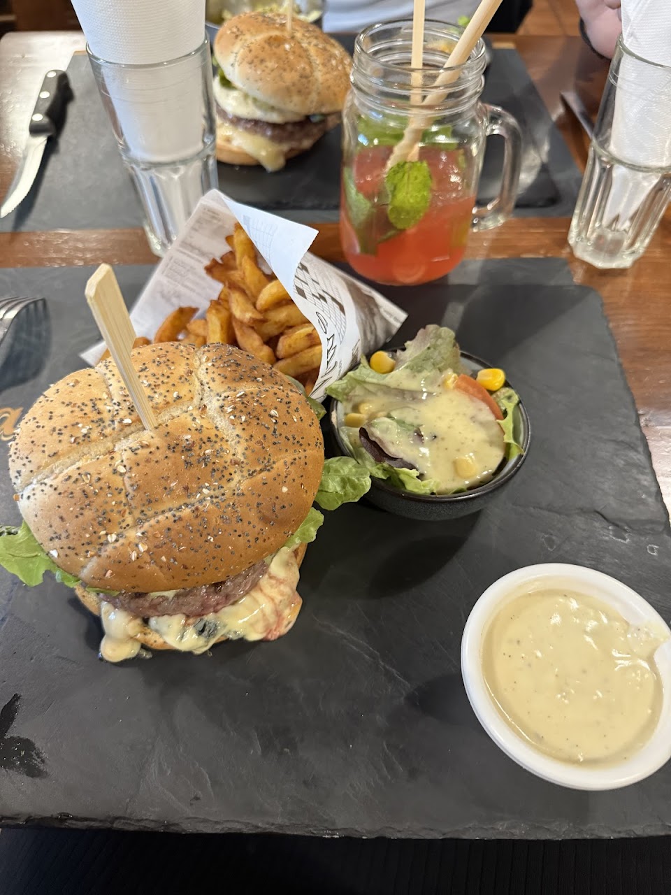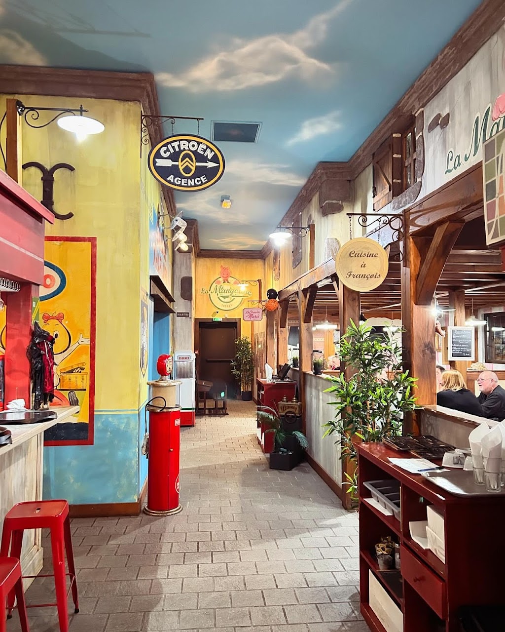 Die Einrichtung ist warm und gemütlich (Jeantous Stall, der Käsekeller, die Küche von François, Maries Zimmer, die Garage) und die traditionelle, kreative Küche der Auvergne ist hausgemacht. Die Speisekarte besteht aus Menüs, Salaten, Truffade, Pounti, Tripoux, Brasserie-Gerichten, Farinettes (Crêpes), Burgern, VBF-Grillgerichten, frischen Pommes frites und hausgemachten Desserts.