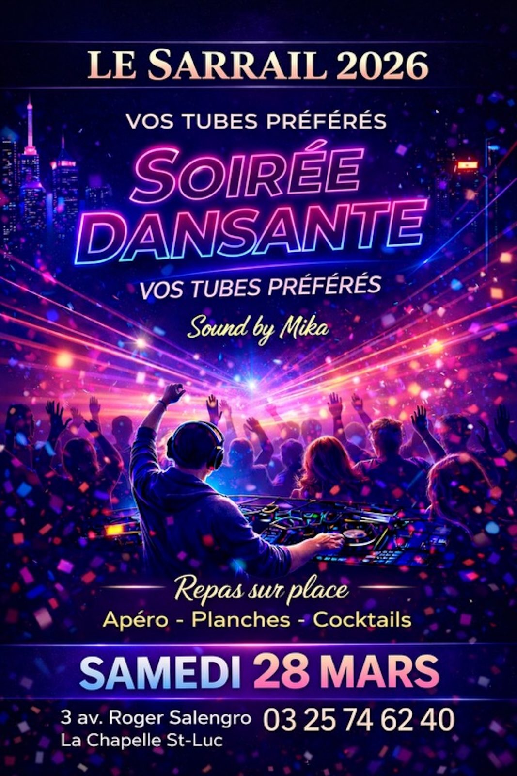 Am 28 Mär 2026 3 avenue Roger Salengro, 10600 La Chapelle-Saint-Luc Öffnungszeiten ansehen Datum Preise Dienstleistungen Lage In der Nähe Zurück zur Liste Datum Am 28 März 2026TageÖffnungszeitenSamstagUm 19h30 Preise Gratuit Zahlungsmittel Kreditkarte Scheck Chèque Vacances (Ferienscheck) Bar Kontaktloses Bezahlen Apple Pay Dienstleistungen Ausstattung Parkplatz Kostenlose Parkplätze Lage