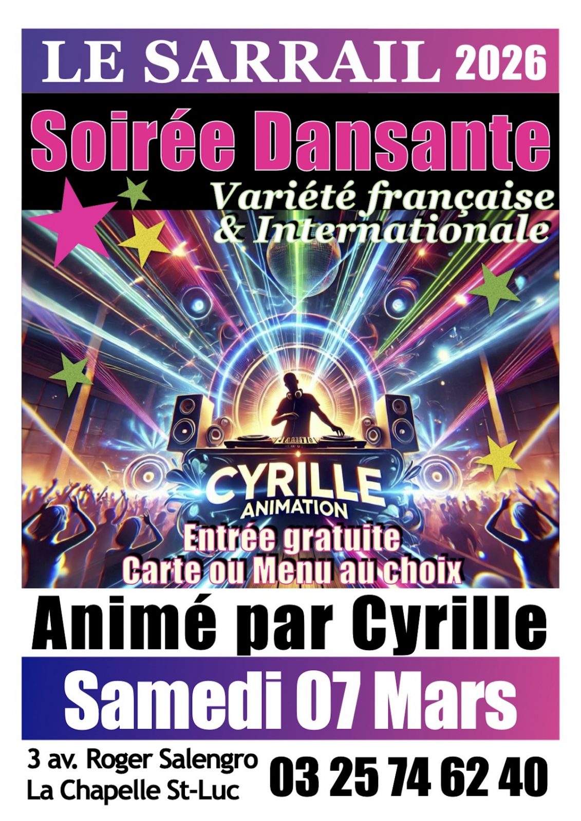 Am 07 Mär 2026 3 avenue Roger Salengro, 10600 La Chapelle-Saint-Luc Öffnungszeiten ansehen Datum Preise Dienstleistungen Lage In der Nähe Zurück zur Liste Datum Am 07 März 2026TageÖffnungszeitenSamstagUm 19h30 Preise Gratuit Dienstleistungen Ausstattung Parkplatz Kostenlose Parkplätze Lage
