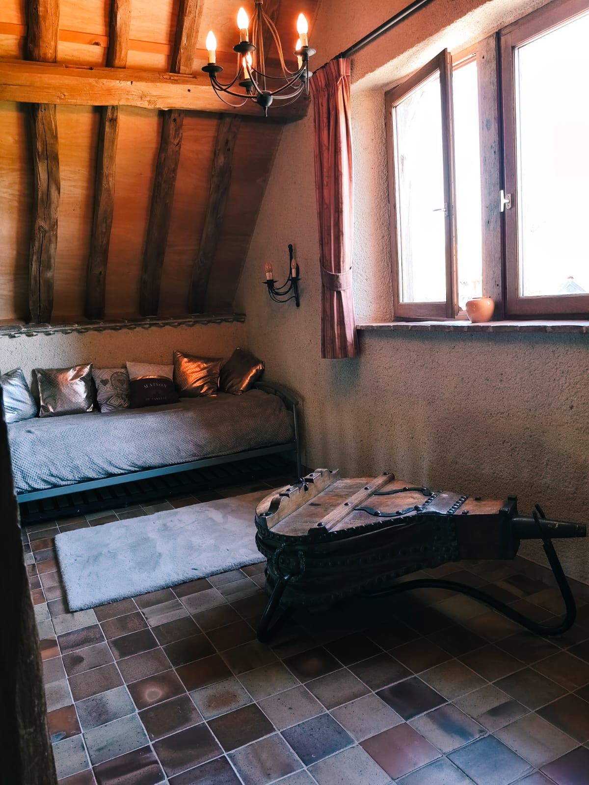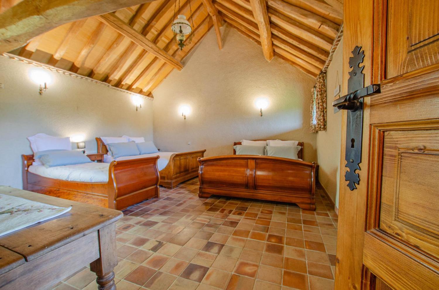 Im Obergeschoss befinden sich ein Dreibettzimmer (Bett 140×190 + Bett 90×190), ein Zweibettzimmer (2 Betten 90×190) und ein Familienzimmer (Bett 140×200, Bett 160×200 und Bett 90×190), das mit einem Fernseher ausgestattet ist. Sie profitieren außerdem von einem Zwischengeschoss, das als Entspannungsraum mit Sofa und Fernseher eingerichtet ist, einer Spielecke für die Kinder, einem Badezimmer (Badewanne + Doppelwaschbecken) und einem separaten WC mit Handwaschbecken.